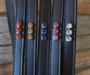 Rein produced in soft and flexible leather lined with rubber for a better grip. Dressed with decorative gems closest to the bit.