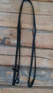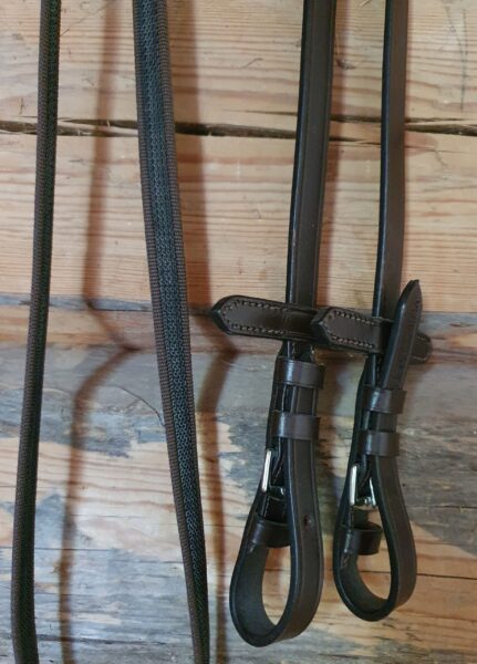 Rein produced in soft and flexible leather lined with rubber for a better grip. Only leather closest to the bit. Available in brown or black