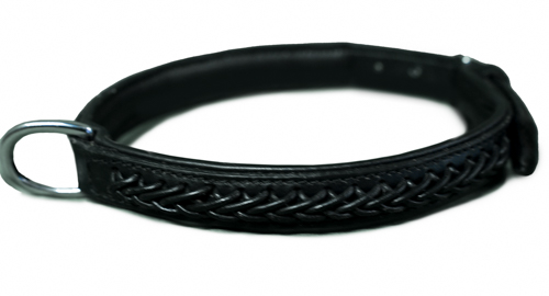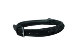 Läderhalsband som är mjukt, fodrat och har en flätad detalj.